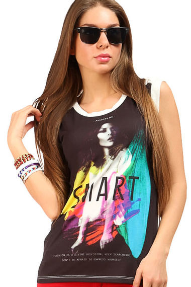 Стильная летняя футболка без рукавов из шифона. Основной коричневый цвет оттеняет контрастная белая отделка горловины и пройм. На груди яркий рисунок.