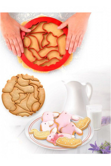 • Форма-трафарет позволяет вырезать сразу пятнадцать животных, рыб и птиц с помощью одного надавливания на раскатанное тесто.